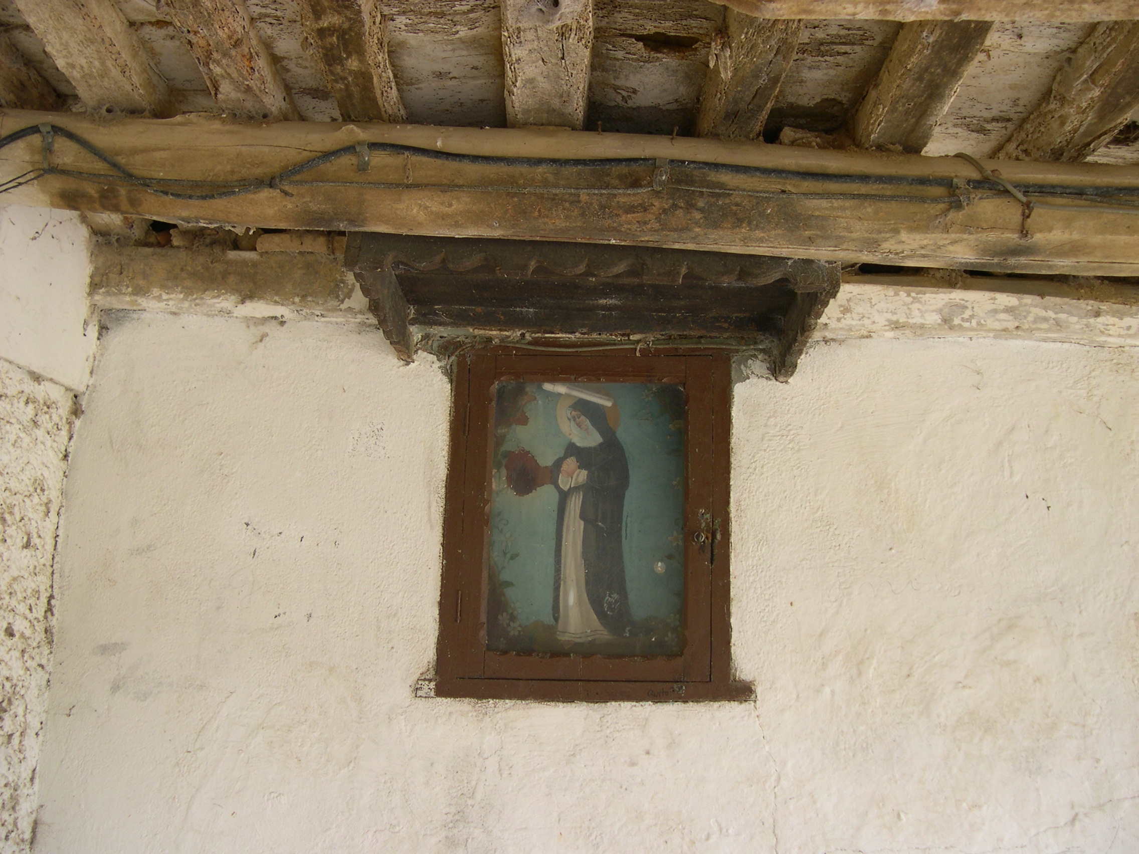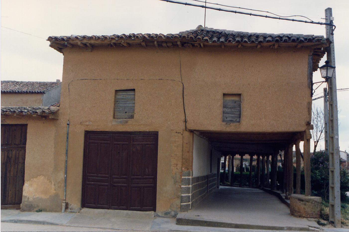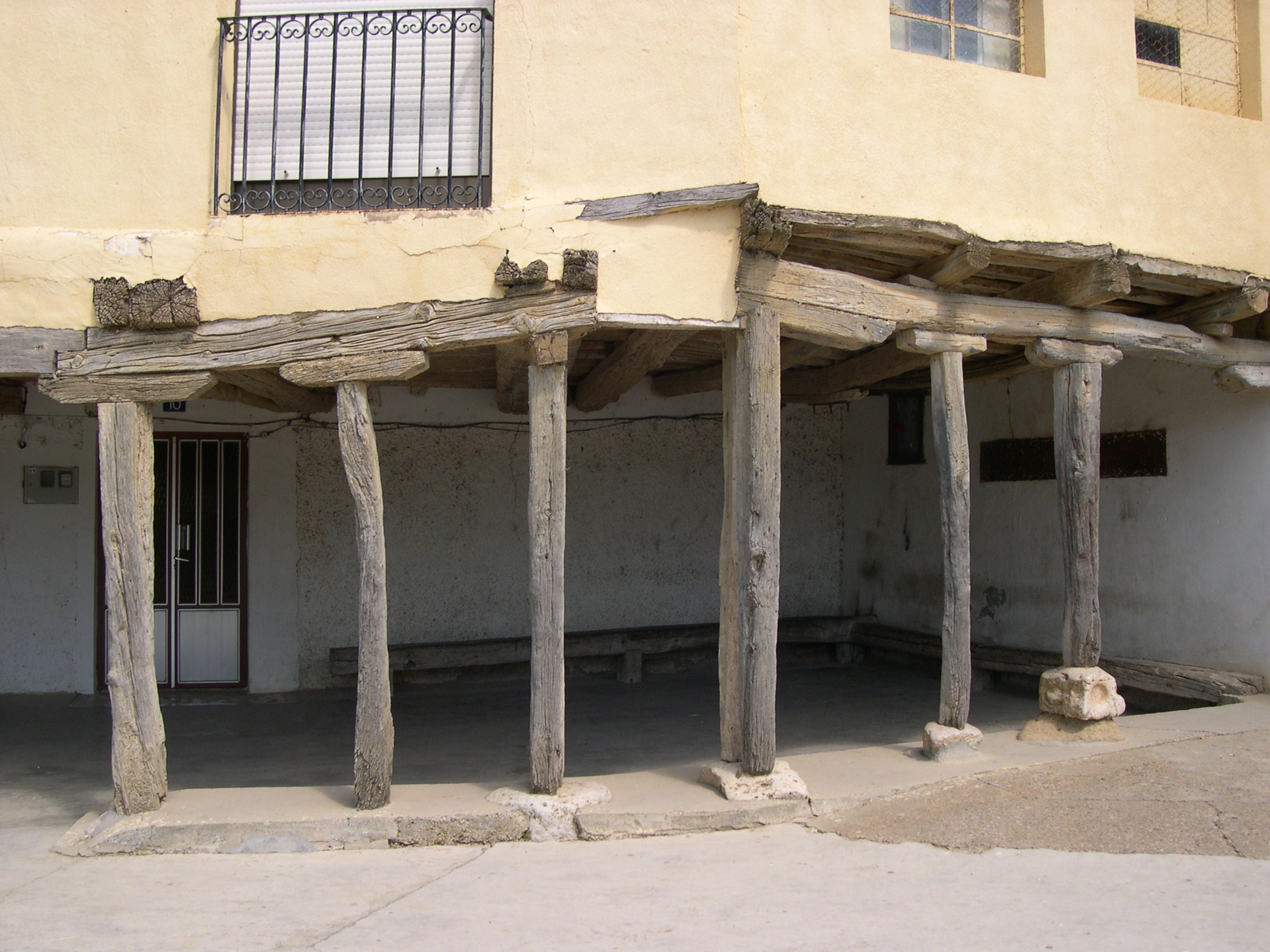 Imagen 1. Edificio con soportales en la Plaza Mayor. Imagen 2 y 3. Edificio soportalado construido con tierra. Imagen 4. Ayuntamiento de Cuenca de Campos. Imagen 5. Casa en la Plaza Mayor. Imagen 6. Detalle del soportal de madera. Imagen 7. Imagen de la virgen en los soportales de la Plaza Mayor